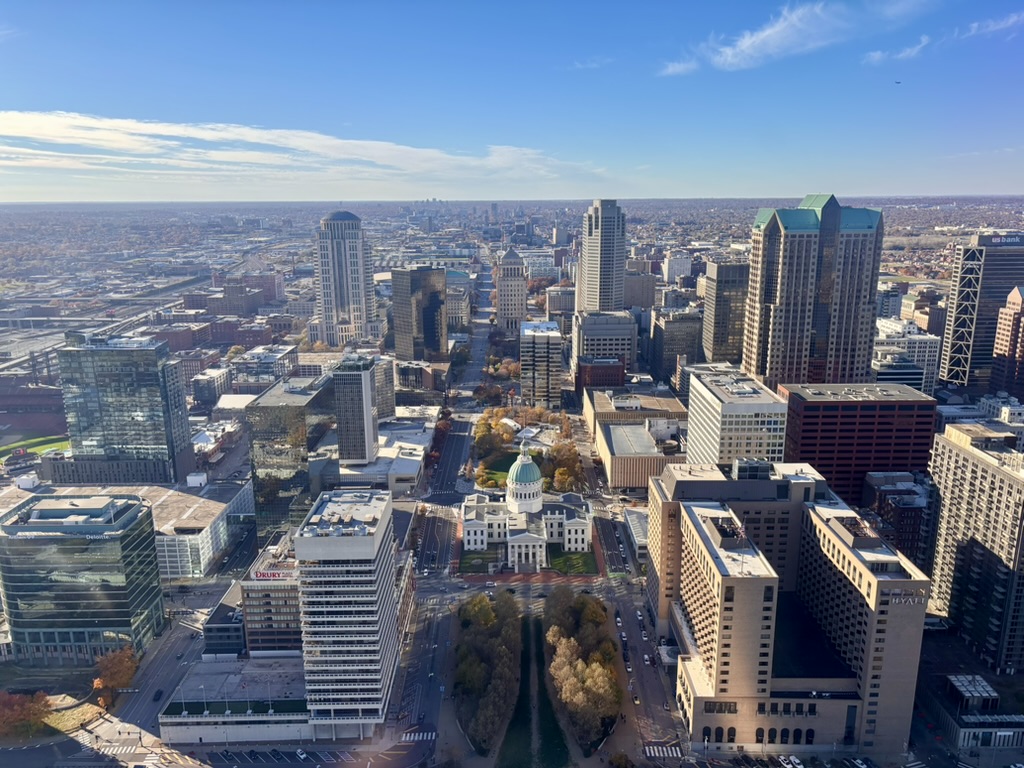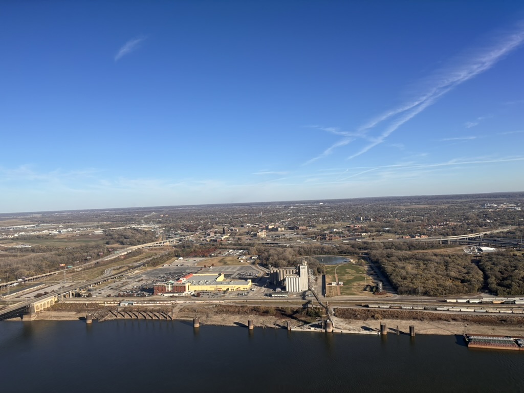 On clear days, visitors can ride the tram to the top of the Arch, where sweeping views of the city and the Mississippi unfold beneath the sky. Across the river lies East St. Louis, and from above, the sharp contrast between the two sides becomes even more evident.